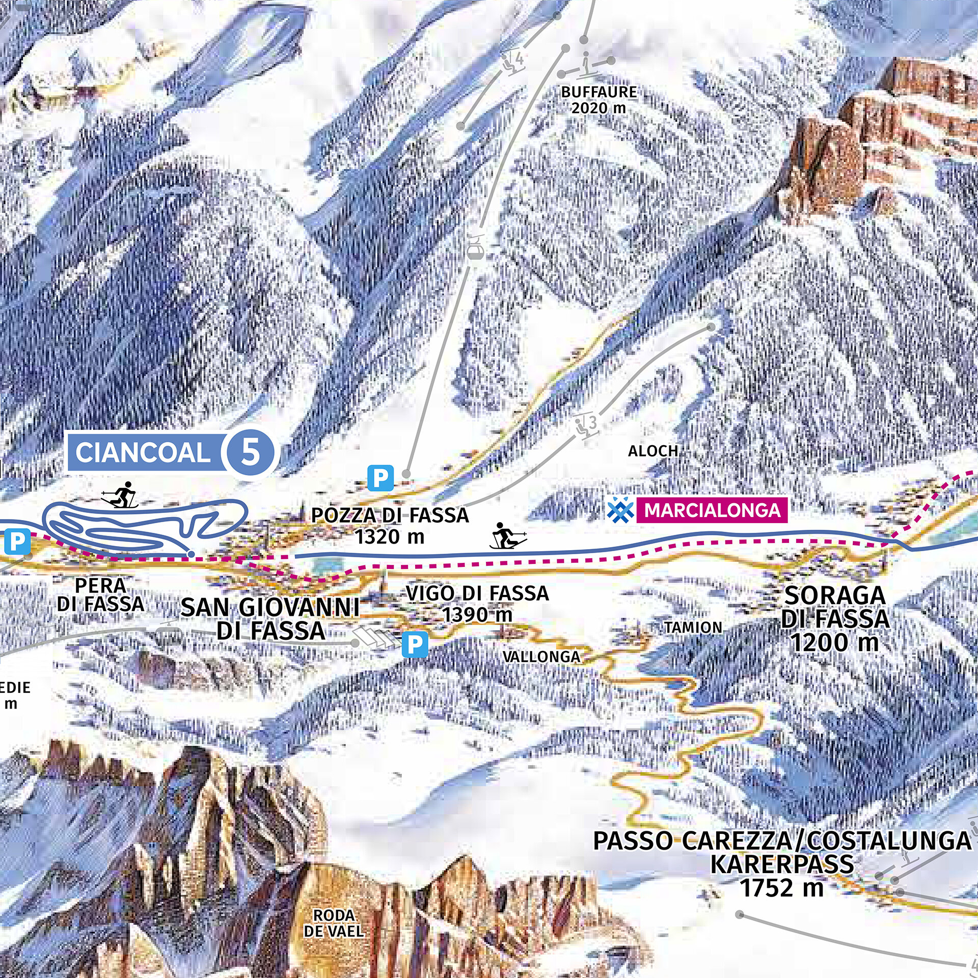 Die Strecken in der Gegend von "Ciancoal", zwischen Pozza und Pera, sind in Rundstrecken und nach Schwierigkeitsgrad unterteilt. Die leichte Piste mit null Höhenunterschieden ist perfekt für diejenigen, die ihre schmalen Skier erst vor kurzem angeschnallt haben und sich immer noch mit Balance und Koordination vertraut machen müssen. Die mittelschwere Strecke, die für alle zugänglich ist, schlängelt sich durch ein großes und sonniges Gebiet, das zuerst in den oberen Teil von "Meida" führt, dann in das Dorfzentrum zurückkehrt und in Richtung San Giovanni und Soraga weiterführt. Die schwierigste und anspruchsvollste Runde führt nach Mazzin. Von Pera aus geht es auf die Strecke der Marcialonga, dem bekanntesten Langlaufwettbewerb Italiens.