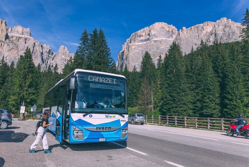 Der effiziente und schnelle öffentliche Nahverkehr macht die Nutzung des Autos im Fassatal überflüssig. Sobald Sie im Tal angekommen sind, können Sie sich bequem und schnell von einem Ort zum anderen fortbewegen. Darüber hinaus werden von Juni bis September auch die Dolomitenpässe regelmäßig mit Linienbussen bedient. Denken Sie an die Umwelt und helfen Sie uns dabei, Sie einen grünen Urlaub verbringen zu lassen!