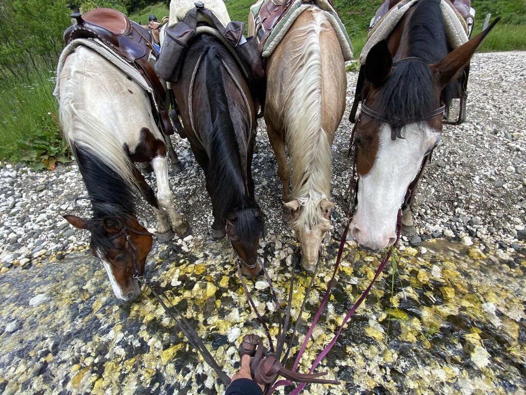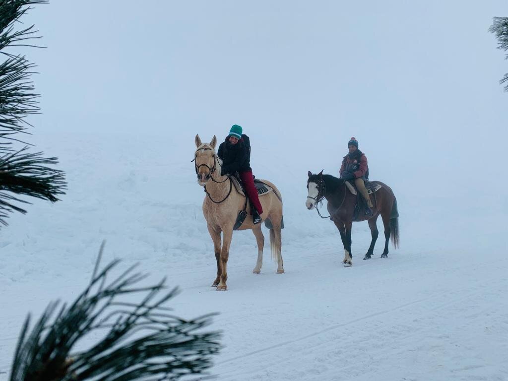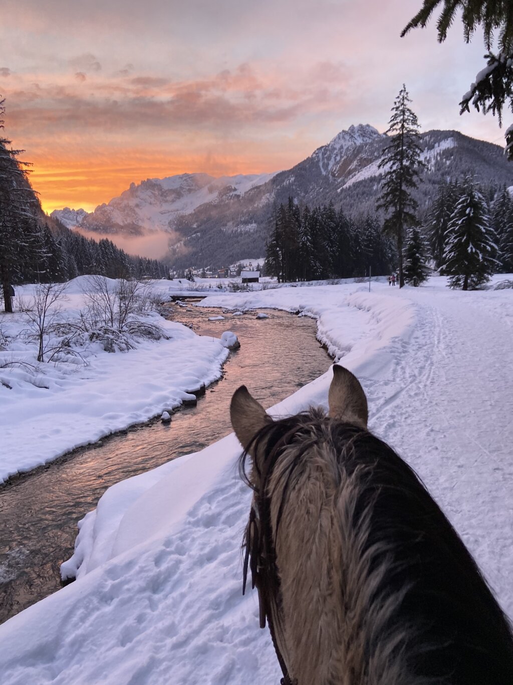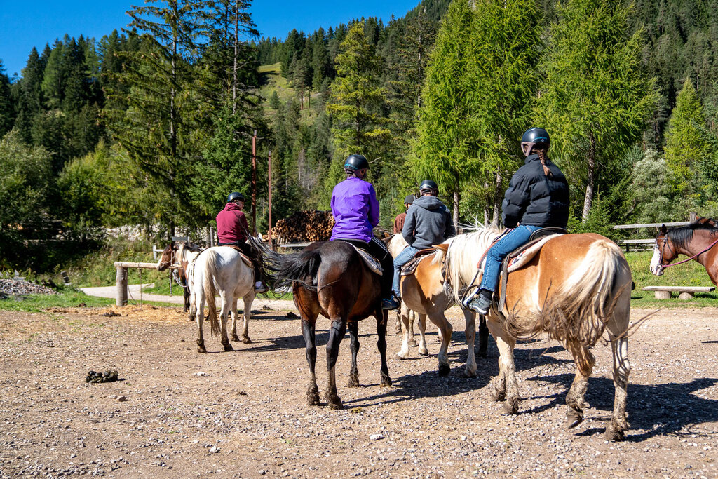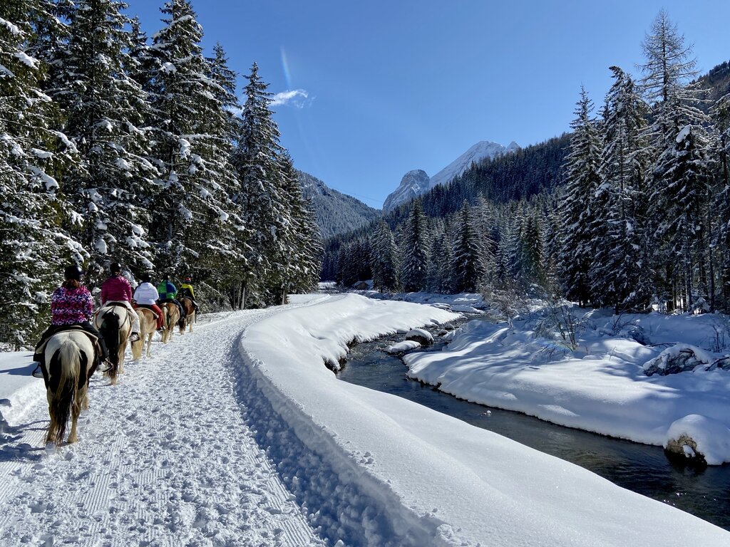 Carlotta und ihre Mitarbeiter organisieren Spaziergänge und Lektionen, im Grünen der Natur oder im Schnee, von 30 Minuten bis zu Trekking, die einen ganzen Tag dauern, geeignet für alle. Sie überqueren die Wiesen, die den Bach "Avisio" säumen, und steigen im Wald zu Aussichtspunkten auf, um die Dörfer von oben mit den Gipfeln des Pordoi und des Gran Vernel in Sichtweite zu bewundern. Möglichkeit, Ausflüge mit Pony für Kinder und romantische Reiten zu zweit in der Umgebung der Dolomiten zu buchen. Im Winter wird auch Equestrian Ski Dragging praktiziert.
