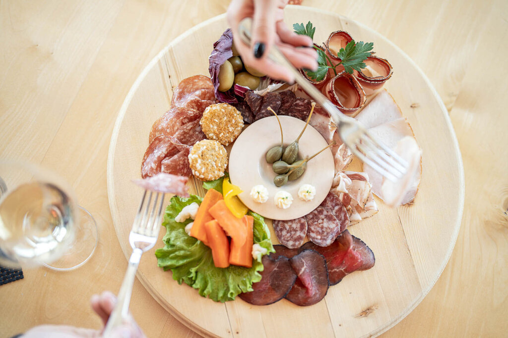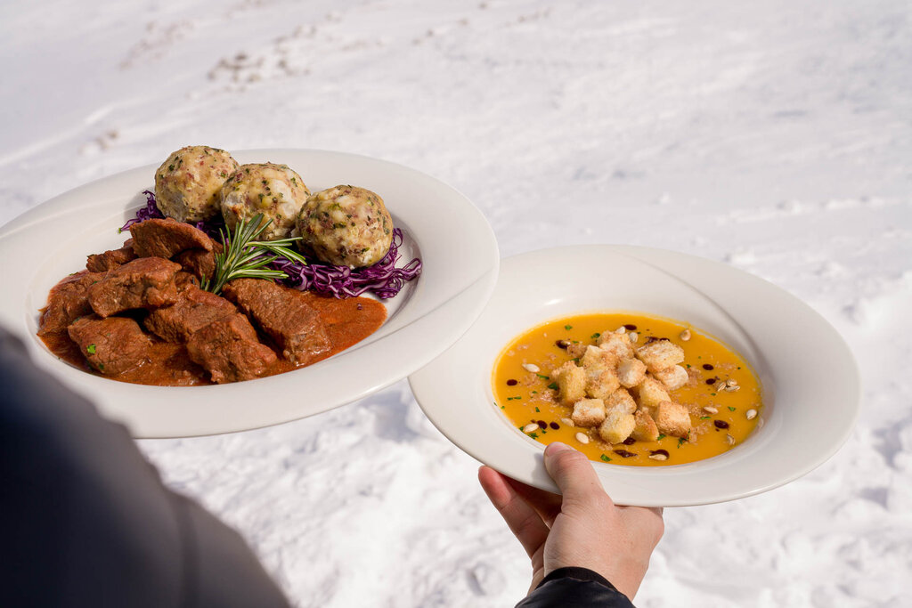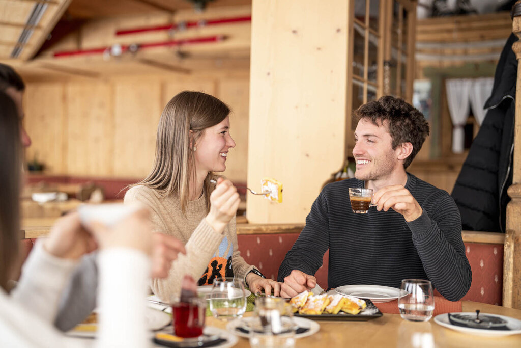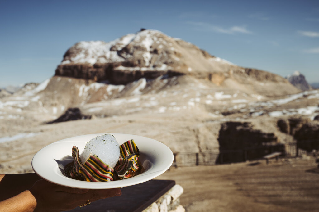 Es ist ein einzigartiger Ort auf der Welt, der einen Besuch wegen des 360° -Panoramas auf die Dolomiten absolut wert ist: Der Blick reicht von den benachbarten Gruppen der Marmolata und des Langkofels über die Tofane, die Pale di San Martino bis zu den österreichischen und Schweizer Alpen. Vom Sass Pordoi starten im Sommer verschiedene Wanderungen, darunter die Besteigung des Piz Boè (3150 Meter), im Winter anspruchsvolle Freeride- und Skitouren. Das Rifugio Maria, ein gemütlicher Ort mit großen Fenstern, die Mittagessen und Snacks mit außergewöhnlicher Aussicht ermöglichen, bietet eine große Auswahl an Gerichten der italienischen und traditionellen ladinischen Küche, darunter auch vegetarische Varianten. Auf fast 3000 Metern wird der Gaumen unter anderem mit Wurst- und Käseplatten, Knödeln, Tagliatelle mit Wildragout, Gulasch mit Polenta, Entrecote vom Rind mit Salat und warmem Gemüse und auch mit der sehr empfehlenswerten "Carne Salada" verwöhnt. Auch die Desserts sind hervorragend, vom traditionellen Strudel mit Vanillesoße über Apfelkuchen bis hin zu Panna Cotta mit Beeren. Wer möchte, kann Salate oder warme Brötchen verzehren und nationale und internationale Weine sowie Craft-Biere genießen.