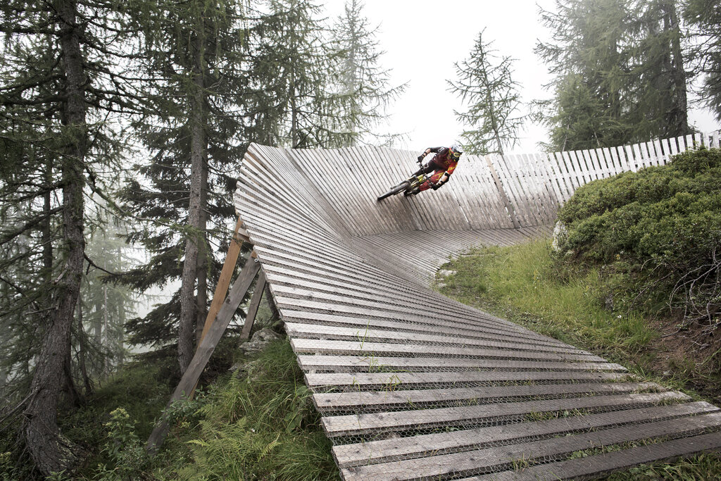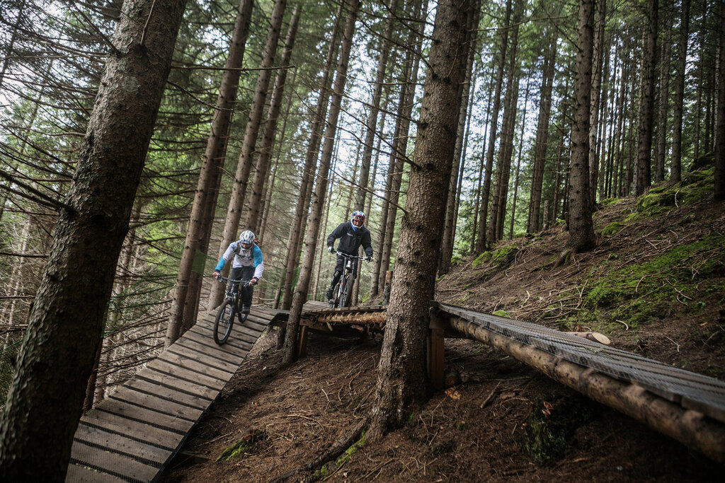 Der kürzeste Trail ist 600 Meter lang und hat einen Höhenunterschied von 60 Metern. Der längste erreicht mit 710 Metern Höhenunterschied mehr als 5 Kilometer. Dazwischen Sprünge, Tropfen, Flow-Linien, schnelle Strecken, Parabolkurven, Strukturen im Stil der Nordküste, die sich entlang der Skipisten und Wälder des Gebiets zwischen Col Rodella (Campitello) und Belvedere (Canazei) entwickeln. Nicht zu unterschätzender Aspekt: Der Fassa Bike Park wird von schnellen Kabinenbahnen, Sesselliften und Seilbahnen bedient. Dolomiten, Wiesen, Schotter, Wälder, Schlamm: Das dürfen sich Gravity-Fans im Val di Fassa nicht entgehen lassen. Die meiste Zeit steht der Fahrer auf den Pedalen, die Arme dämpfen die Unebenheiten des Geländes, die Hände sind fest auf dem Lenker und die Finger immer bereit auf den Bremsen. Zu Beginn verlässt man sich auf die Instruktoren der Fassa Bike MTB School, um von Anfang an die Regeln des Spiels zu erlernen. Natürlich muss man ein wenig waghalsig sein, schnelle Reflexe haben, wissen, wie man mit dem Mountainbike umgeht, und vor allem die maximale Konzentration während der Abfahrt aufrechterhalten.