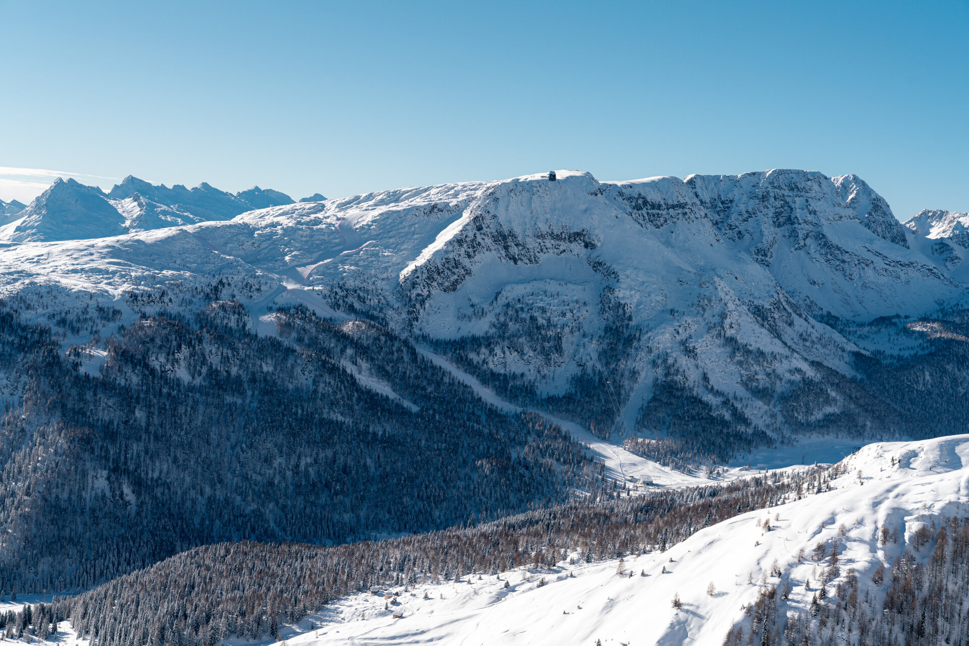 Die Piste im Skigebiet San Pellegrino verbindet hohe Geschwindigkeiten mit technischem Anspruch. Sie beginnt auf 2.480 m Höhe am Col Margherita und führt bis auf 1.880 m am Dolomitenpass hinunter. Das ergibt eine Gesamtlänge von 2.400 m und einen Höhenunterschied von 600 m. Die Strecke ist nicht ganz neu: Der erste Abschnitt verläuft parallel zur Piste, die zum Cavia-See führt, bevor sie in Richtung Pass abbiegt und sich schließlich mit der Direktstrecke Col Margherita verbindet. Kurz vor dem Richtungswechsel beginnt der herausfordernde Abschnitt der schwarzen Piste La VolatA: mit einer maximalen Steigung von 50 % (im Durchschnitt ca. 30 %) und einem atemberaubenden Finale durch einen märchenhaften Wald. Da die Abfahrt in einem Zug gemeistert werden sollte, lohnt es sich, vorab ein paar Minuten auf der Terrasse an der Bergstation der Seilbahn zu verweilen. Hier können Sie die spektakuläre Aussicht auf die Pale di San Martino und die Gipfel, die den Pass umrahmen, genießen.