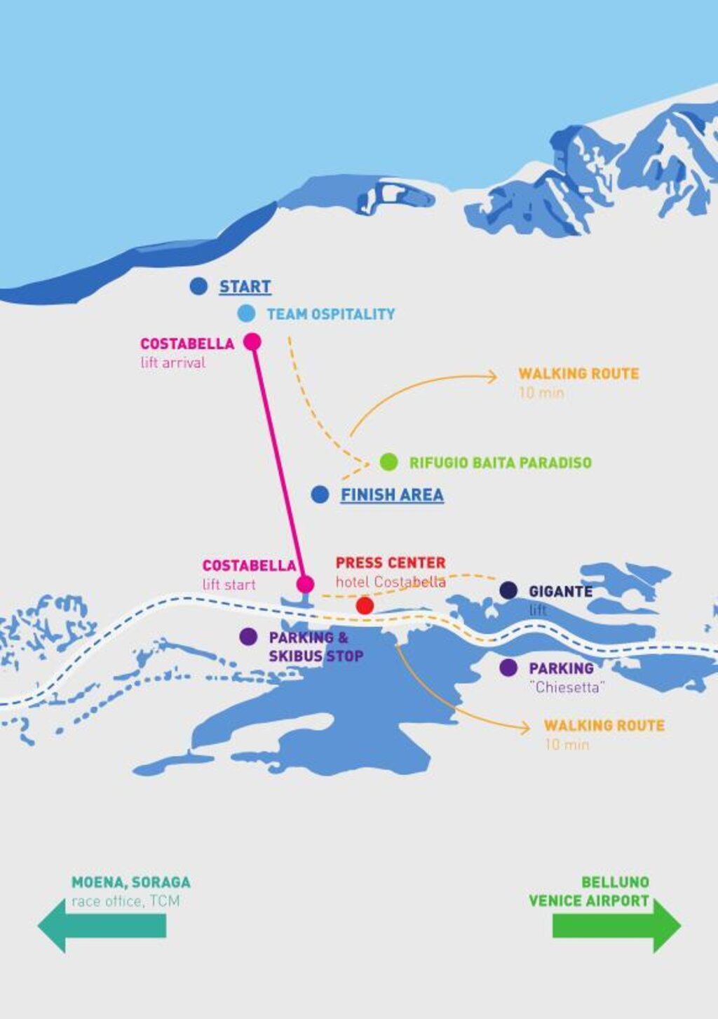 Zuschauer:innen können das Wettkampfgelände bequem mit dem überdachten Vierersessellift "Costabella" direkt vom San Pellegrino Pass aus erreichen. Auch Nicht-Skifahrer:innen haben Zugang zum Zielbereich: Ein eigens eingerichteter Fußweg führt von der Bergstation rund 600 Meter entlang der Strecke talwärts. Für Freitag und Samstag ist ein Sondertarif für die Bergbahn vorgesehen.