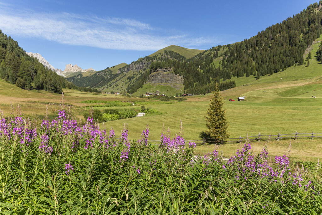 From Campitello, ascend towards Val Duron, a wonderful carpet of grass and flowers, sprinkled with cabins and streaked by the crystal-clear water of the homonymous river.